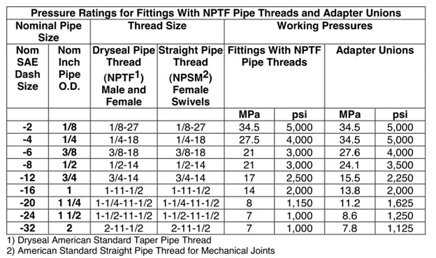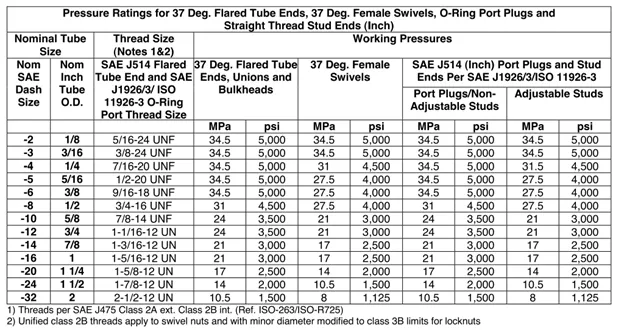 The rated working pressure for any fitting is based on the lowest pressure rated fitting end. For example, a fitting may include one -4 (1/4") male 37 degree tube end and one -6 (3/8") male pipe end. From the tables below, the rated working pressure for the -4 male 37 degree tube end is 34.5 MPa (5,000 psi) and the rated working pressure of the -6 (3/8") male pipe end is 21 MPa (3,000 psi). The rated working pressure of the fitting would be 21 MPa (3,000 psi).