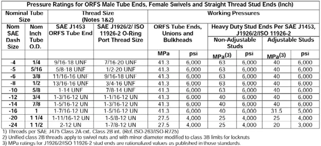 The working pressure ratings listed below are based on a 4:1 design factor for minimum burst. As specified in SAE J514, these are dynamic pressure ratings and the fittings are capable of passing a cyclic endurance (impulse) test for one million cycles at 133 % of the corresponding working pressure.
