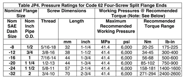 Note: SAE J518, Code 61 and Code 62 Four-Screw Split Flange connections are non-threaded port ends which utilize O-Rings for sealing. They are assembled to ports with split flange clamp halves, and clamping pressure is provided by screws or socket head cap screws of SAE Grade 8 or ISO Class 10.9 material as specified in SAE J429 and ISO 898-1.