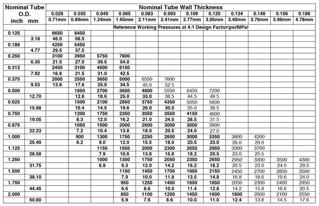 The following chart lists the nominal pressure ratings of tubing products which conform to SAE J524, SAE J525, SAE J526 and SAE J365. These pressure ratings are derived from the Lamé formula with 12,500 psi (86 MPa) allowable stress factors and approximately 4:1 design factor. Pressure values shown in bold are for tubing wall thickness normally considered suitable for 37 degree single flaring to SAE J533. Many factors influence the pressure at which a hydraulic system will perform satisfactorily. The values shown below should not be used as a standard or specification and are not to be construed as guaranteed minimums.