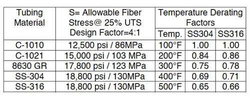 Design stress and temperature derating factors for typical hydraulic system tubing materials and temperature ranges are listed below. Derating factors for SS-304 and SS-316 are derived from ASME 831.1-2012 Edition. Carbon steel tubing in these temperature ranges does not require derating.
